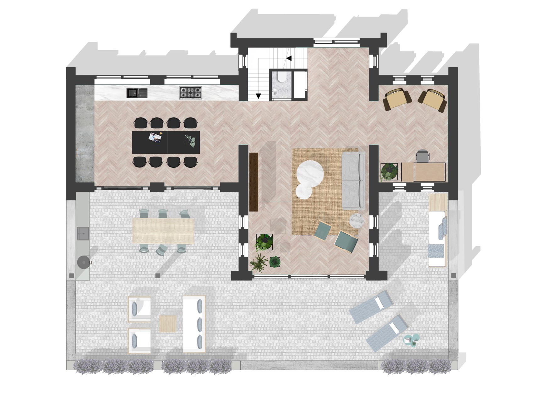 De villa heeft een woonoppervlakte van ca. 180 m2 met een aaneengesloten overdekt terras om de achtertuin te integreren en verbinden met de leefruimte.
